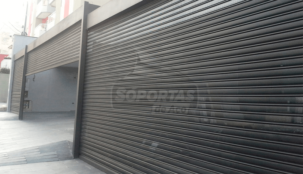 Trata-se do tipo de porta mais usado nas lojas. As chapas de aço apresentam ranhuras que reforçam a estrutura. São mais baratas, mais barulhentas e mais pesadas. Mesmo assim, ainda são as preferidas dos pequenos lojistas. São totalmente vedadas e indicadas para aberturas com até 3,8 metros, principalmente em lojas que ficam totalmente fechadas à noite e nos finais de semana. Aberturas maiores precisam de colunas intermediárias (colunas feitas com calha metálica). Consulte a Só Portas, que tem soluções para todo tipo de projeto com portas raiadas.