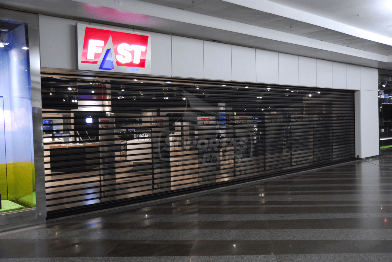 Todo tipo de porta de aço de enrolar pode ser automatizado e existem soluções para aberturas maiores sem colunas de concreto. Precisa que o cliente possa ver o interior da loja quanto a porta estiver fechada?